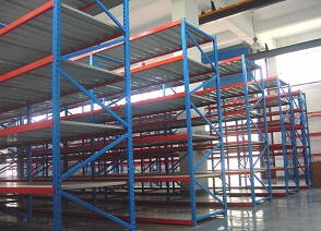 采用柱片與橫梁掛接的結構,易為插接組合式,橫梁以50mm節距調節層高,適合于承載大且橫梁較長(cháng)的情況下,通常每層載重量在350-800kg時(shí)使用較合適。層面可鋪鋼板、亦可鋪木板(原木木板、中纖板、帖塑刨花板等)。